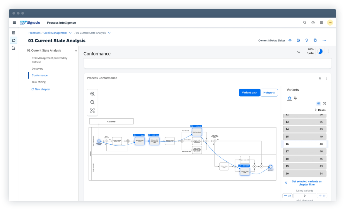 - Comprenda el estado de sus procesos y modelos de recorrido, identifique oportunidades de mejora y evalúe el impacto de cambios potenciales antes de implementarlos.