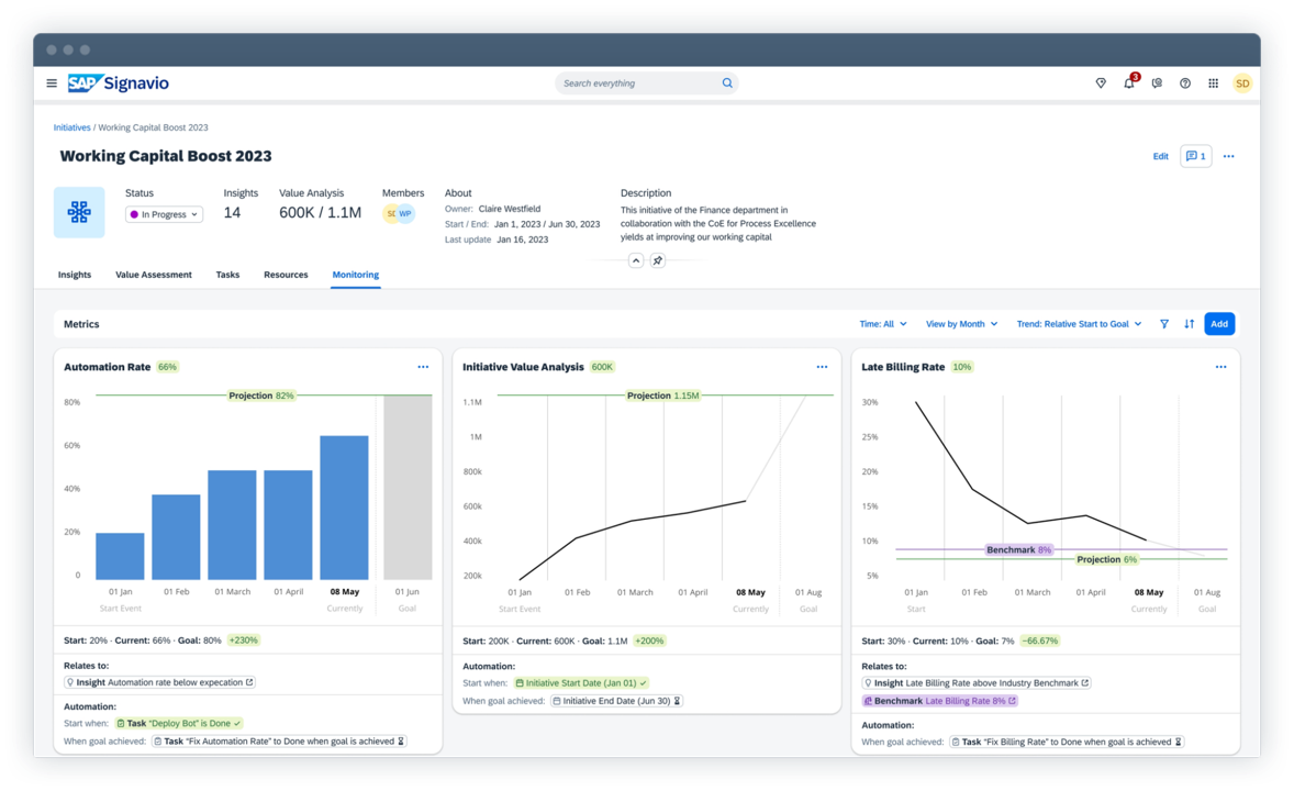 - Aproveche sugerencias basadas en IA sobre procesos e indicadores de desempeño para incrementar la eficiencia.